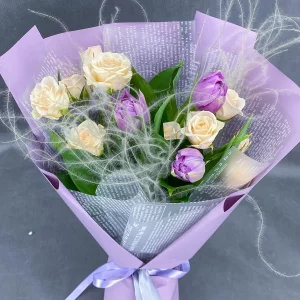 Моя нежность! - букет из тюльпанов и кустовой розы