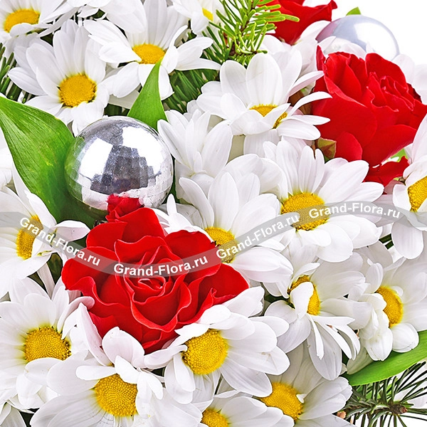 ЛЮКС: Хризантема кустовая ромашковая - 12 шт, роза красная - 9 шт, рускус, хвоя, шары новогодние "серебро" - 5 шт, оазис, лукошко.